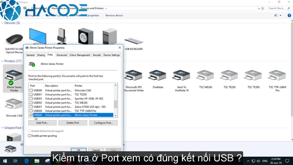 Bước 10: Để đảm bảo máy in bill Dataprint E5 có thể hoạt động bình thường, bạn phải vào tab Port để kiểm tra nhằm đảm bảo cổng kết nối đúng là cổng USB