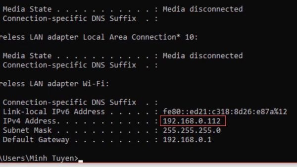 Vào Start, gõ lệnh cmd, sau đó nhập lệnh: ipconfig