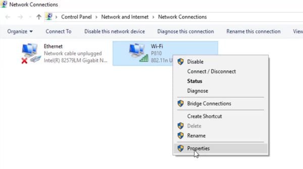 Bạn vào Control Panel -> Network and Internet -> Network Connections -> Chọn mạng wifi mà máy tính đang kết nối -> Properties
