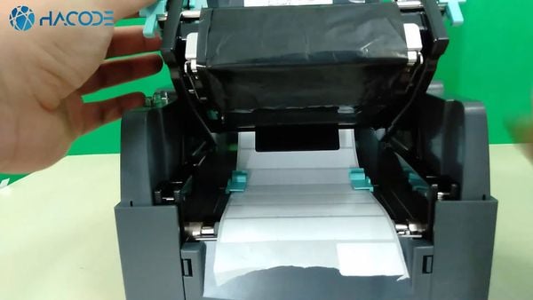 Bạn thả cuộn decal đã được lắp trục đỡ và thanh chặn vào rãnh lắp decal của máy in mã vạch Godex G500.