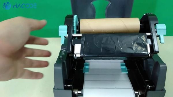Ba là, bạn xoay bánh răng nhựa màu xanh theo chiều kim đồng hồ để kéo căng ruy băng mực, giúp cho quá trình in tem diễn ra chính xác.