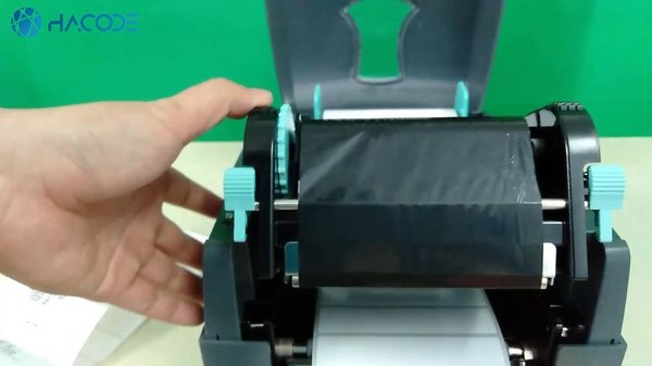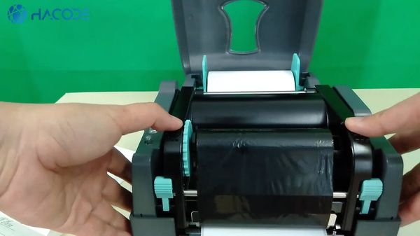 Ba là, bạn xoay bánh răng nhựa màu xanh theo chiều kim đồng hồ để kéo căng ruy băng mực, giúp cho quá trình in tem diễn ra chính xác.