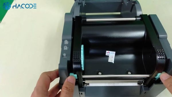 Bạn ấn tay vào 2 chốt ở 2 bên máy để mở nắp máy in mã vạch Godex G530 ra.