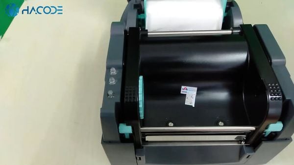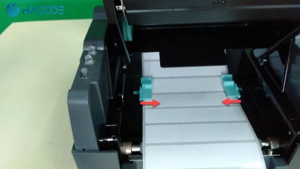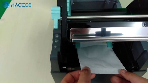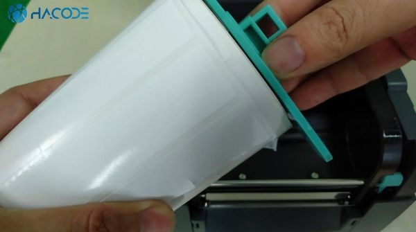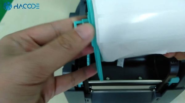 Bạn thả cuộn decal đã được lắp trục đỡ và thanh chặn vào rãnh lắp decal của máy in mã vạch Godex G530.