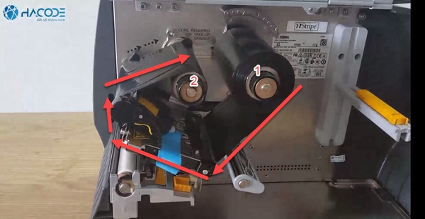 Trục số 1 là trục để lắp cuộn mực nguyên, số 2 là trục để cuốn cuộn mực thừa khi đã in