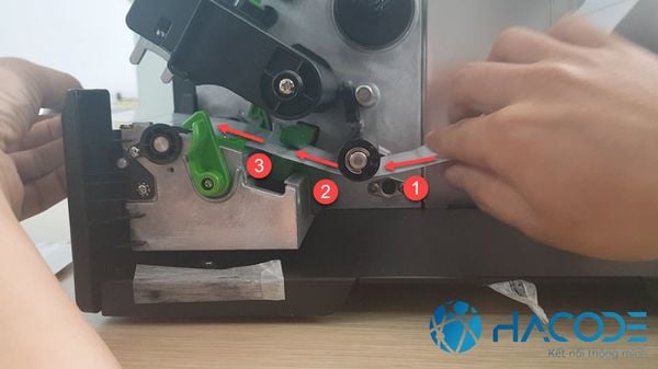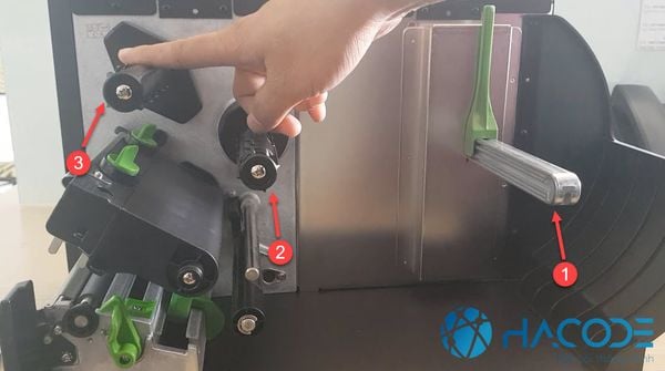 Bước 10: Bạn luồn đề can xuống dưới trục định vị (1), đồng thời luồn đề can qua thanh kẹp màu xanh (2) và thanh định vị đề can (3) như dưới đây: