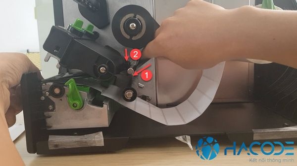 Bước 12: Bạn luồn ruy băng mực đi phía dưới thanh kim loại (1) và đi vào giữa thanh nhựa định vị màu đen (2)