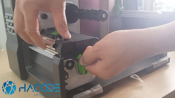 Bước 3: Đẩy chốt nhựa màu xanh ra và mở đầu in lên