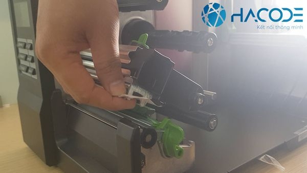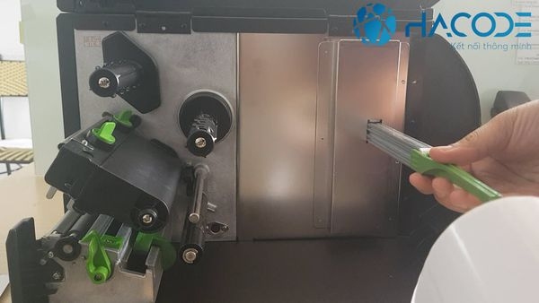 Bước 9: Bạn dựng thanh chặn nhựa lên để giữ cố định cho cuộn đề can. Lưu ý là không để thanh chặn quá sát cuộn đề can, để cuộn đề can có thể dễ dàng được cuốn ra trong quá trình máy in vận hành.