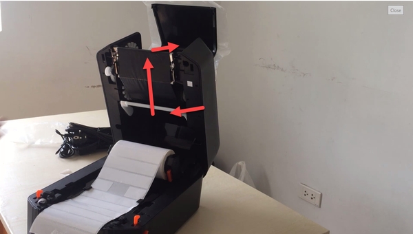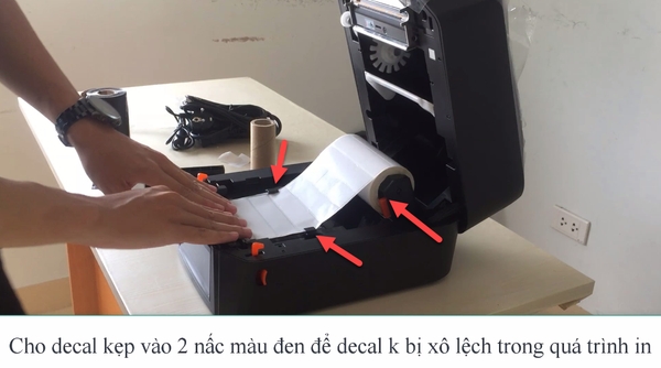 Lắp cuộn decal vào đúng vị trí như dưới hình ảnh sao cho mặt có tem nhãn ở phía trên