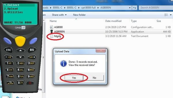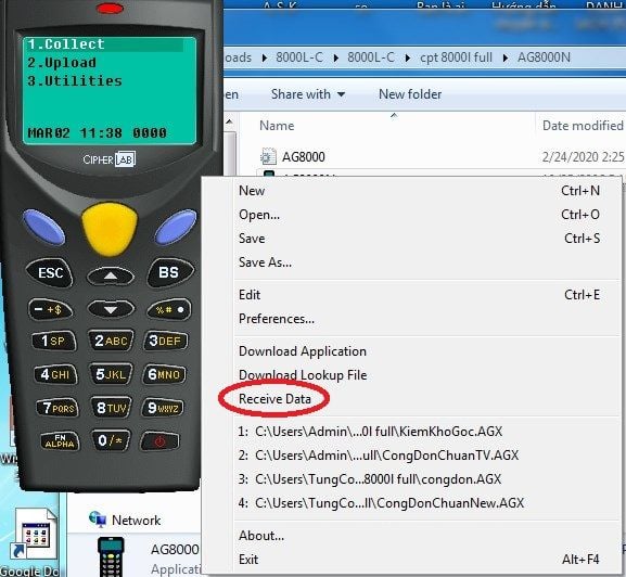 - Bước 1: Bật máy kiểm kho sau đó vào mục upload( Xuất dữ liệu) ấn phím xanh ( Enter) . Cắm máy kiểm kho vào đốc chuyển dữ liệu. Tiếp tục chạy file 8000L/C