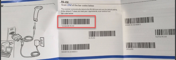 Bước 5: Quét máy LS2208 vào mã STANDARD RS-232 ở trong tài liệu đi kèm với máy để có thể chuyển đổi chế độ đọc mã vạch từ USB -> COM.