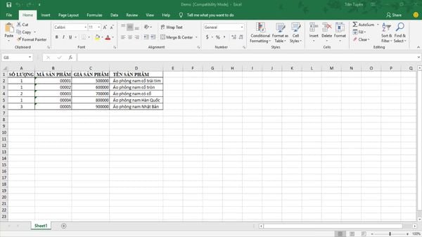B1: Bạn tạo 1 file Excel có các trường thông tin tương ứng với với các trường ở trên file Bartender, bao gồm: Mã sản phẩm, Giá sản phẩm, Tên sản phẩm; ngoài ra có thêm trường Số lượng (để tùy chỉnh số lượng tem in ra).