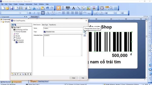 B10: Bạn click vào biểu tượng Change Data Source Type để thay đổi kiểu của nguồn cấp dữ liệu cho trường Mã vạch sản phẩm