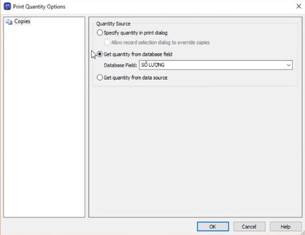 - Khi bạn chọn giá trị của Database Field là "SỐ LƯỢNG" thì số lượng mỗi mã tem in ra sẽ tương ứng với giá trị ở cột "SỐ LƯỢNG" của mỗi mã tem của từng loại sản phẩm đã được thiết lập sẵn trong file Excel. Đối với trường hợp cụ thể này là: