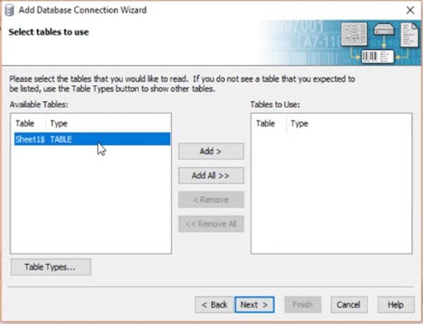 B6: Bạn phải chọn đúng sheet chứa dữ liệu cần kết nối với Bartender (ở đây là Sheet 1). Sau đó click nút Add rồi Finish là hoàn tất.